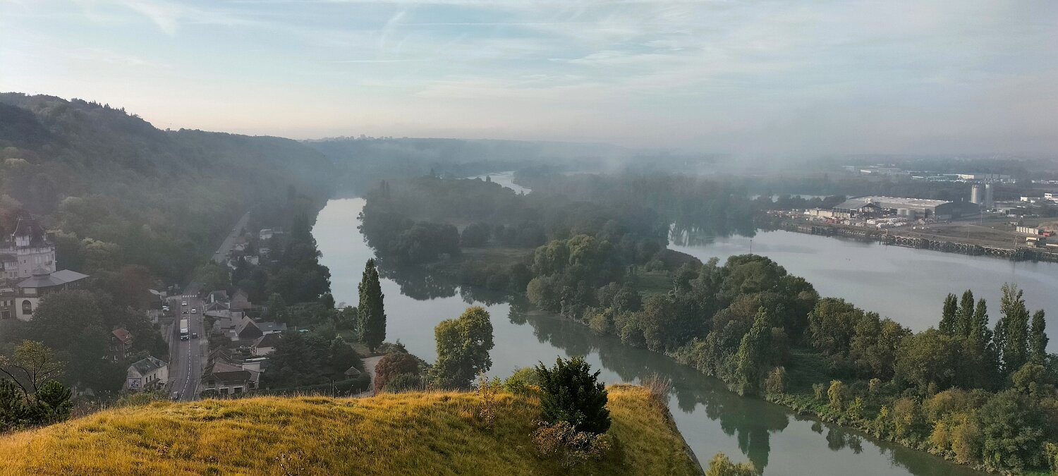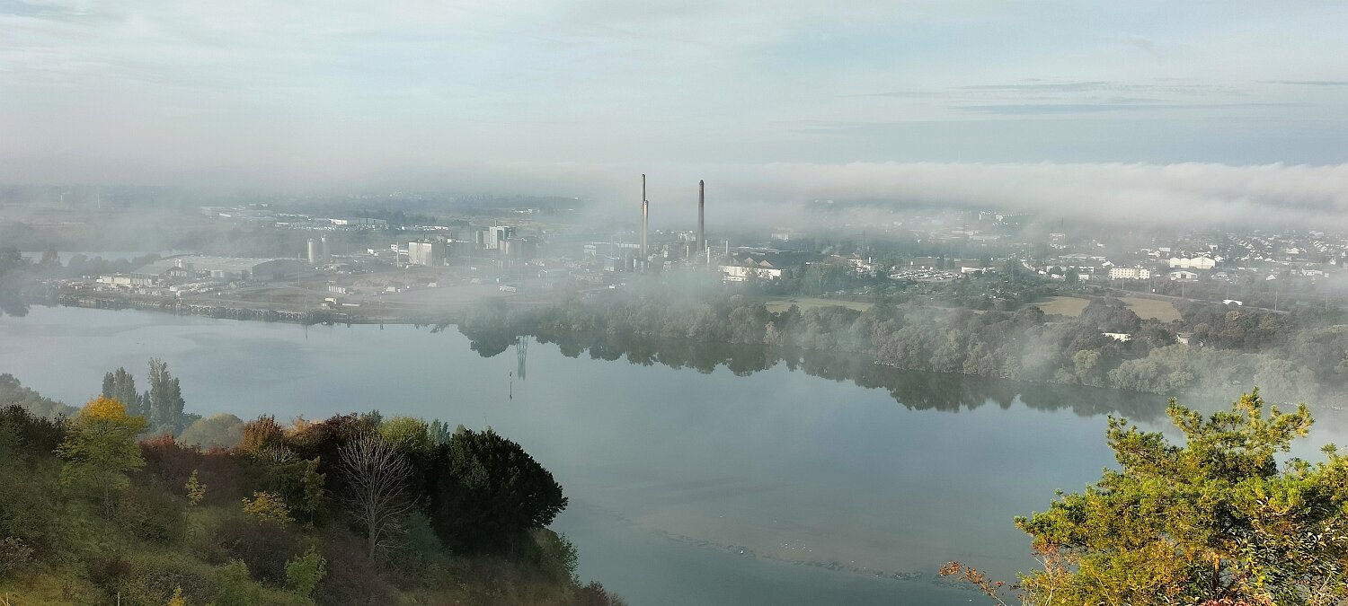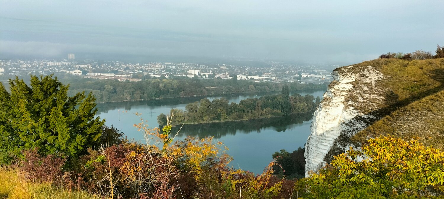 Boucle de 10 Km Plus de détails : clic ici 6 personnes ce matin. St Étienne-du-Rouvray dans la brume. Ça se lève vite. On se repère :-) En bas, La Seine En bas, St Adrien Vue vers Igoville Vue vers Sotteville-lès-Rouen A droite, Oissel 16-10-202518-09-2025
